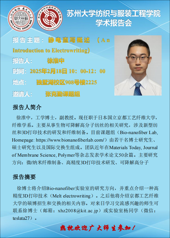 纺织与服装工程学院讲座报告:静电直写概述 (An Introduction to Electrowriting)