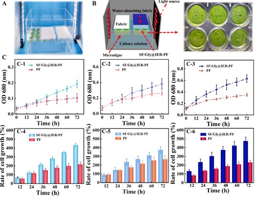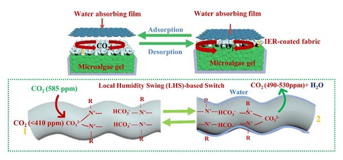 结果表明,基于LHS的IER改性织物系统可以直接捕获大气中的CO2,并将其传输到附着的丝素蛋白/海藻酸盐水凝胶中。在水凝胶中,捕获的CO2被包埋的微藻所利用,导致细胞快速生长以及氧气的持续产生和释放。