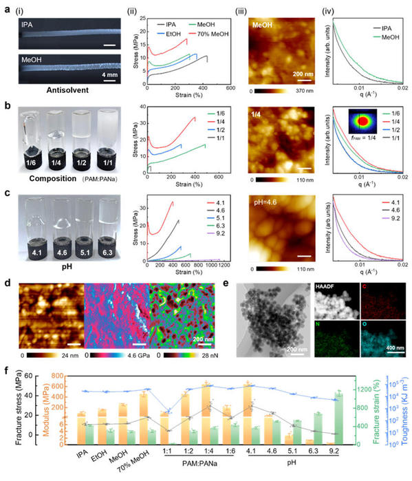 图 2湿法纺丝过程中PANa-PAM 水凝胶纤维的微相分离结构调控:通过优化不良溶剂组成、纺丝液聚合物组成、纺丝液pH有效调控初生纤维中的微相分离结构,获得具有小尺寸、密堆积氢键纳米团簇网络结构的高强韧性纤维