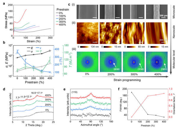 图 3 应变编程诱导PANa-PAM水凝胶纤维的单轴取向和可控结晶:通过后牵伸诱导杂化聚合物分子链取向和结晶,杂化纤维在400%预应变下获得高取向度性分子链和类似于蛛丝β折叠片结晶的正交晶胞共晶结构