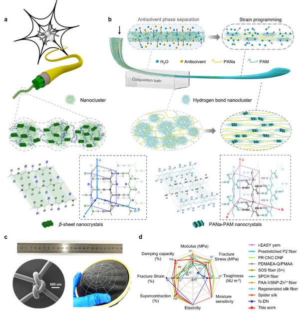 图 1 具有类蜘蛛丝层级结构和性能的聚丙烯酸钠-聚丙烯酰胺(PANa-PAM)杂化聚合物水凝胶纤维仿生制备:a 天然蜘蛛丝层级结构的示意图;b通过可控微相分离和应变编程的湿法纺丝方法制备PANa-PAM水凝胶纤维;c 可规模化生产的坚韧且强度高的水凝胶纤维,可进行复杂打结和直接缝纫;d PANa-PAM水凝胶纤维与天然蜘蛛丝以及已报道的仿生纤维性能比较