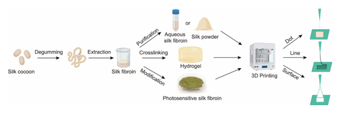 3D打印技术凭借其个性化定制和快速制造复杂三维结构的能力,成为一种具有“自由制造”优势的新兴技术。在这一背景下,3D打印技术在生物医疗领域的发展相当迅速,有望通过制造人工组织和器官,解决组织修复及器官移植的难题。尽管3D打印技术已经取得了显著的进步,材料开发仍然是制约该领域进一步发展的关键因素。因此,科研人员开始探索新的生物墨水来源,例如蚕丝蛋白,特别是丝素蛋白(SF),具有广泛的来源、卓越的生物相容性以及可调节的生物降解性,有望成为新型生物墨水的理想选择。