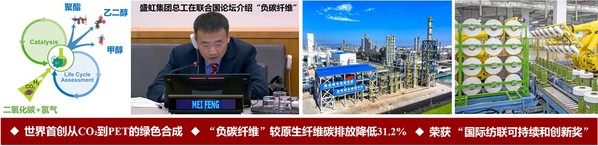 建成全球首条“CO₂捕集利用–绿色EG–功能性PET纤维”低碳循环绿色产业链,10万吨/年CO₂制绿色甲醇项目已正式投产,一期建设完成年产3万吨碳循环利用PET纤维能力,对纺织行业的可持续发展具有示范引领作用。授权发明专利5件,获得“国际纺联可持续和创新奖”,并受邀在联合国可持续发展高级别政治论坛发言,分享绿色发展创新实践经验(图18)。