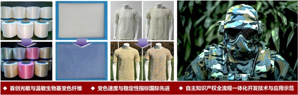 图17 生物基智能变色纤维、面料与迷彩军服应用展示